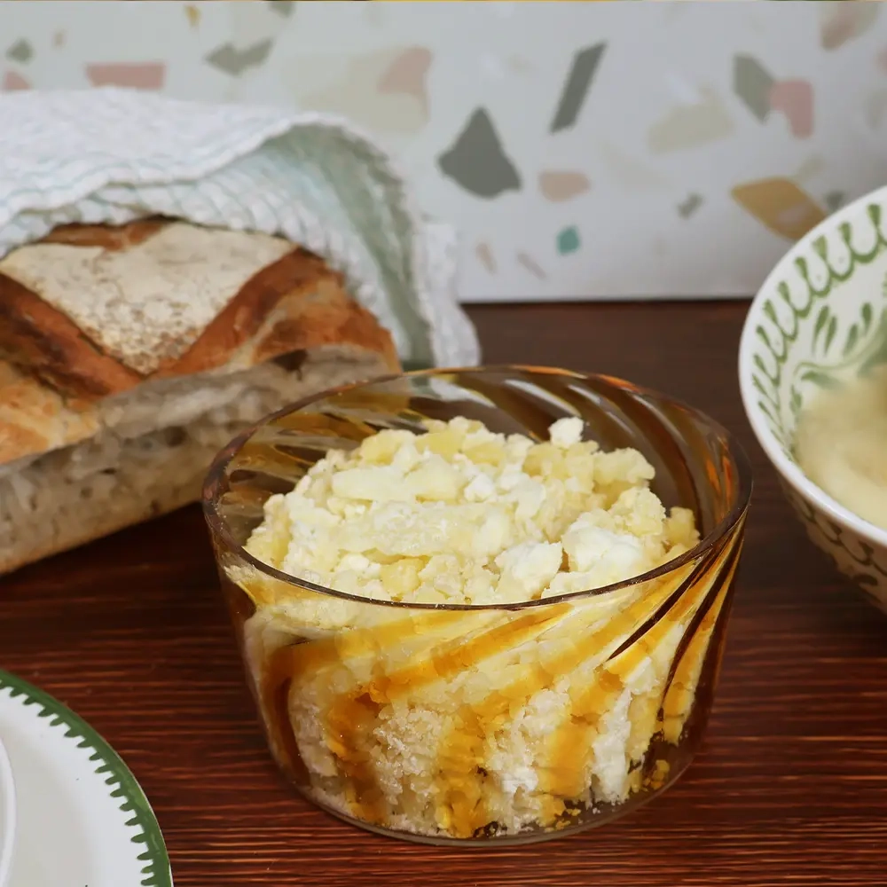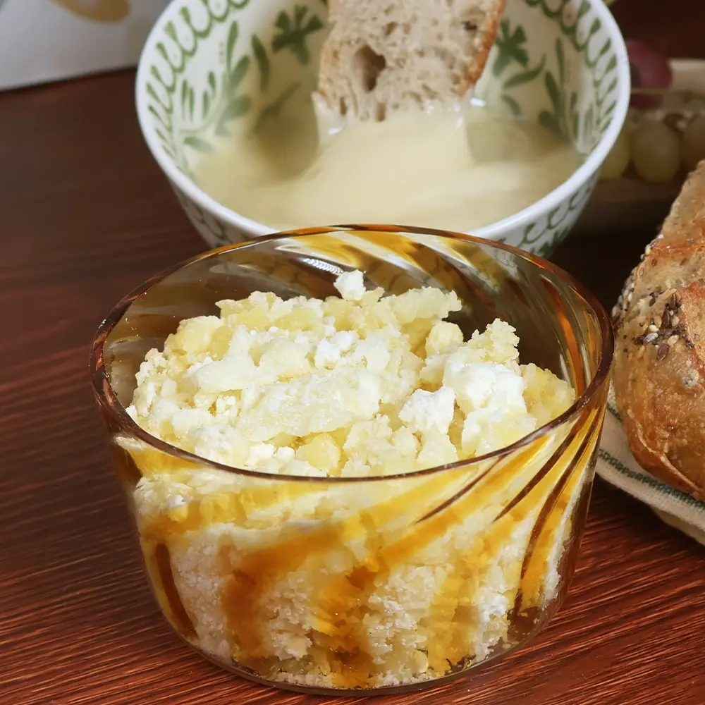 Le Metton n’est pas un fromage comme les autres. Il se présente sous forme de petits cristaux compacts, légèrement granuleux, obtenues à partir de lait écrémé fermenté. À cru, il est ferme, un peu sec, avec un goût acidulé et lacté, mais c’est à la cuisson qu’il révèle toute sa richesse. Il devient alors la base fondante, brillante et légère de la cancoillotte, ce fromage fondu typique qui enchante les tablées comtoises.